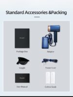 - 【What’s In The Box】 1*IPL Hair removal device main with 1*hair removal lens (3.9cm²) , 1*Bikini lens (3.9cm²), 1* safety goggles, 1*lens cleaning swab, 1*user manual , 1* adapter.
