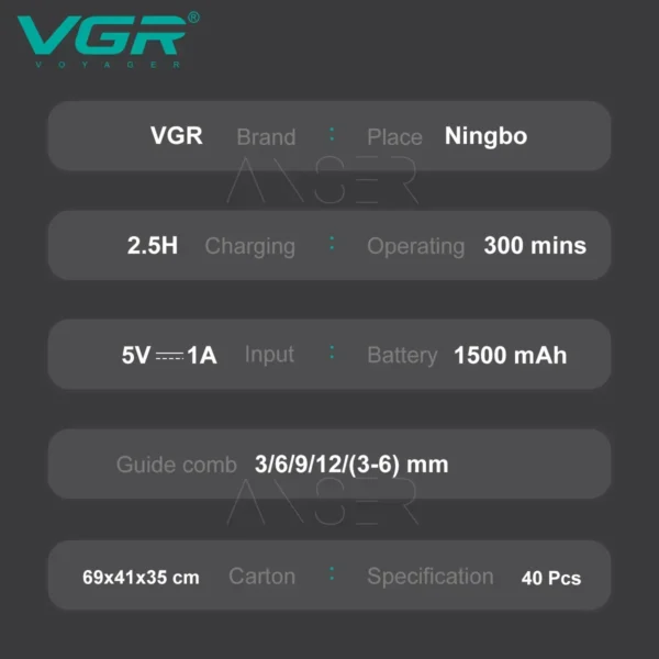 The VGR V-911 is designed to be your ideal companion for daily grooming, combining high efficiency with a modern, ergonomic design. It features Stainless Steel blades that provide a smooth, precise shave without pulling or irritating the skin. Equipped with a 1200mAh lithium battery, it offers up to 180 minutes of runtime after just a 2.5-hour charge. It supports both corded and cordless use for maximum flexibility and comes with 3 guide combs of different sizes to suit all hair lengths and professional beard detailing.