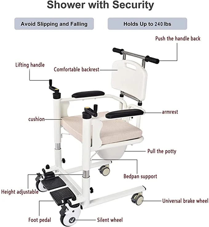 • Sturdy lifting system: Equipped with a powerful lifting mechanism to help transfer the patient from the bed to the chair or vice versa easily and with minimal effort.