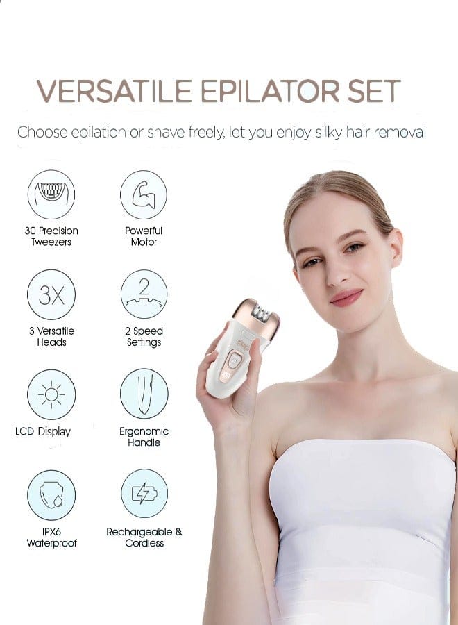 DSP multi-function epilator delivers effective and long-lasting hair removal by removing hair from the roots. It features 3 interchangeable heads for epilation, shaving, and callus removal, with two speed settings suitable for all skin types. Equipped with an LCD battery display and a 400mAh rechargeable battery, it offers a convenient, precise, and all-in-one grooming experience.