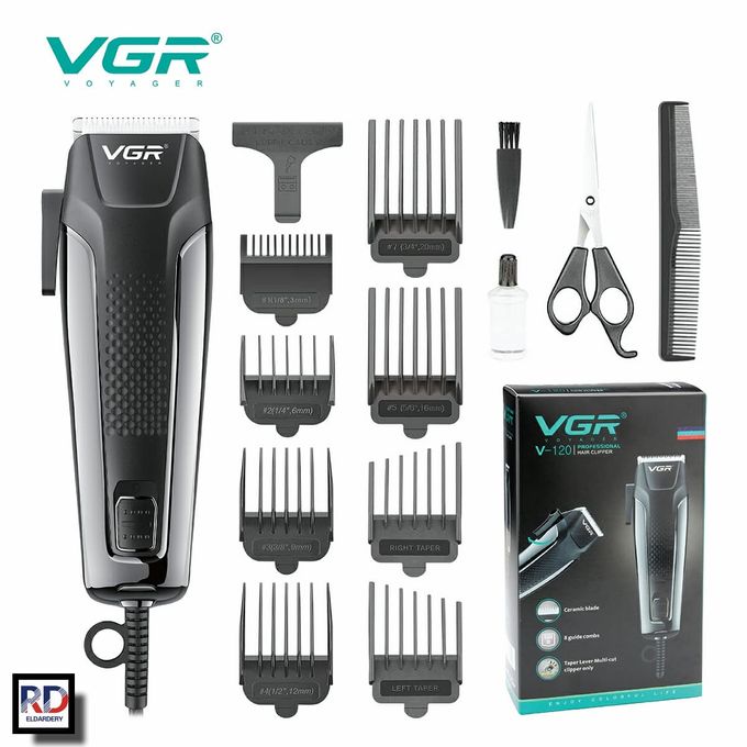 ماكينة حلاقة شعر احترافية VGR V-120 تعمل بالكهرباء مباشرة، مزودة بشفرات دقيقة لطيفة على البشرة وأمشاط توجيه متعددة حتى 20 مم، تمنحك قصًا متقنًا ونتائج احترافية بسهولة في المنزل أو الصالون.