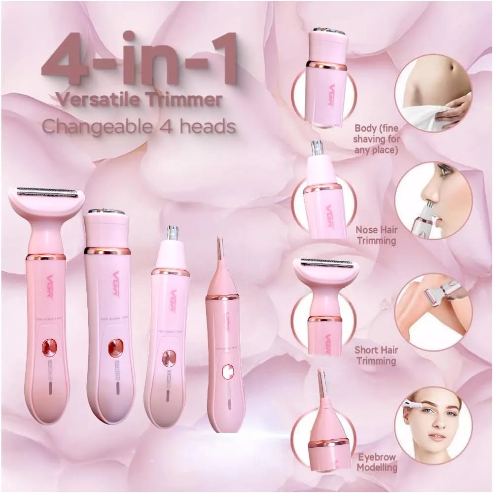 ماكينة حلاقة نسائية متعددة الاستخدامات 4 في 1 من VGR V-761، مزودة بـ4 رؤوس قابلة للتبديل، شفرات ستانلس ستيل لطيفة على البشرة، بطارية ليثيوم 500mAh تمنحك 90 دقيقة استخدام لاسلكي، مقاومة للماء IPX5 وشحن سريع USB — الحل المثالي لعناية دقيقة ومريحة في كل مرة.